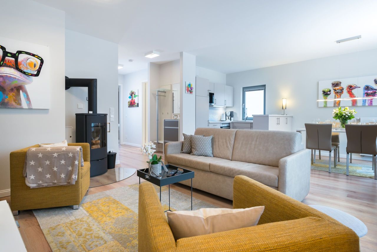 Auch an die Kinder ist gedacht: Sie finden einen Kinderhochstuhl, ein Babybett und Kindergeschirr in der Wohnung vor. In naher Umgebung zur Wohnung gibt es ebenfalls einige Spielmöglichkeiten für die Kleinen. Sei es die Erlebnisseebrücke direkt am Strand, der Kletterspielplatz im Yachthafen – oder bei schlechtem Wetter das Aktiv-Hus im Ferienpark.